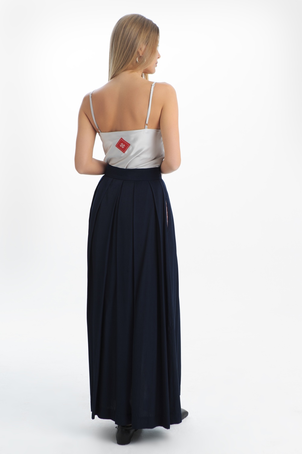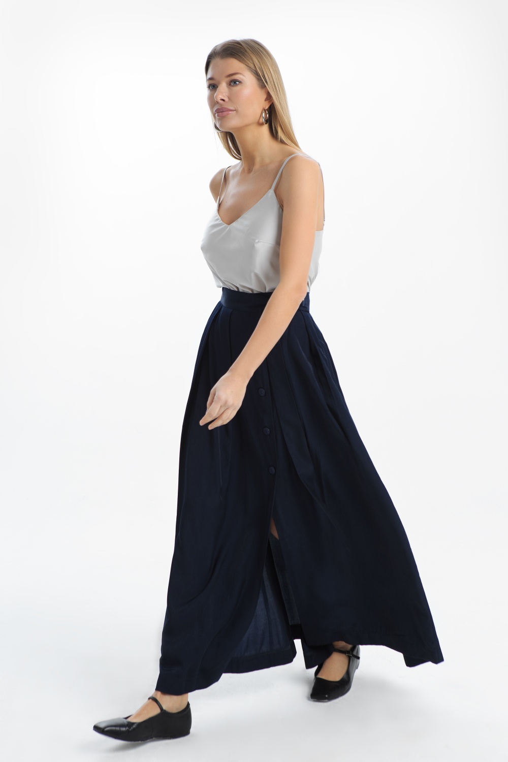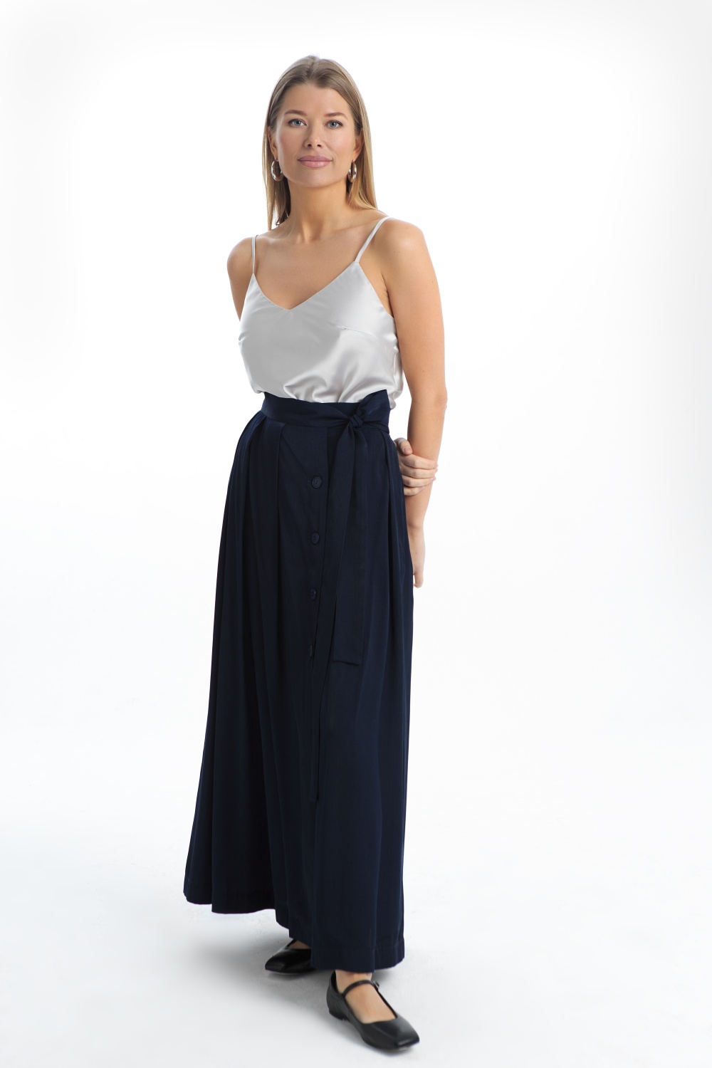 Длинная юбка в темно-синем цвете на запах, создает элегантный и женственный силуэт. Насыщенный темно-синий цвет, выглядит благородно и универсально, легко сочетается с разными верхами. Юбка подходит, как для повседневного образа, так и для праздничного образа.